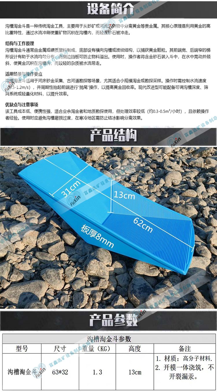 塑料溝槽淘金斗是一種輕便、耐用的淘金工具,通常由高強度工程塑料(如ABS或聚丙烯)制成。其主體結構包括: