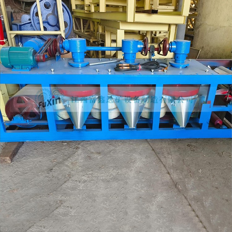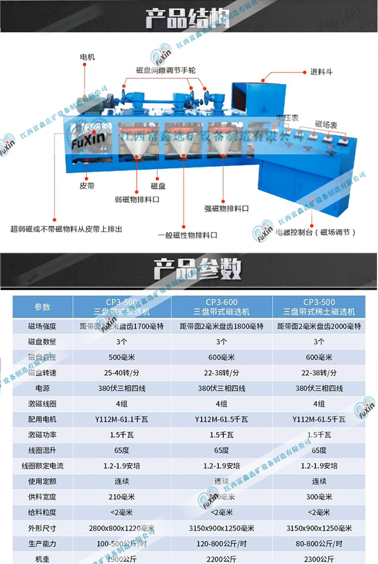 三盤帶式磁選機(jī)是一種高效干式磁選設(shè)備,主要用于細(xì)粒弱磁性礦物(如鈦鐵礦、黑鎢礦、錳礦等)的分選。其核心結(jié)構(gòu)包括三個旋轉(zhuǎn)磁系盤和一條環(huán)形輸送帶,通過交替變化的磁場吸附目標(biāo)礦物,實(shí)現(xiàn)連續(xù)分選。